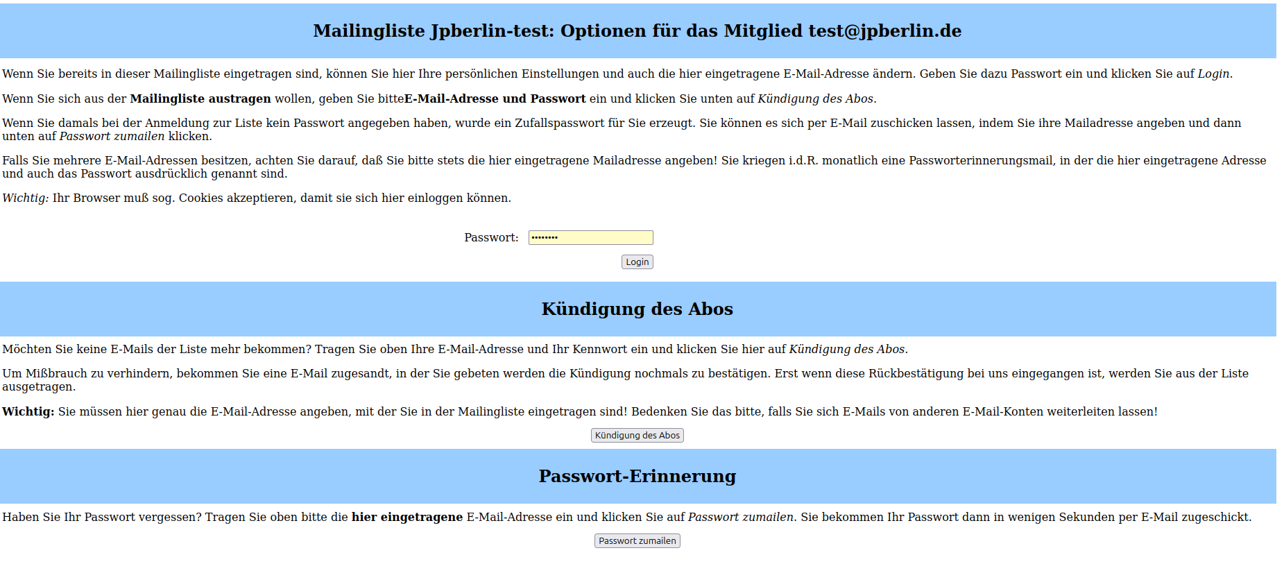 Dort werden dann alle Mailinglisten aufgelistet und können dort auch neu erstellt und gelöscht werden. Das Ändern des Administrator-Passwortes ist dort ebenfalls möglich.